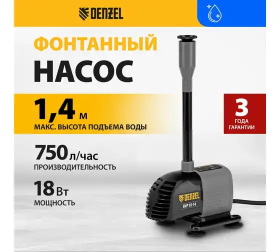 Насос фонтанный Denzel fnp18-14, 18 вт, подъем 1,4 м, 750 л/ч, колокольчик/каскад// 99030