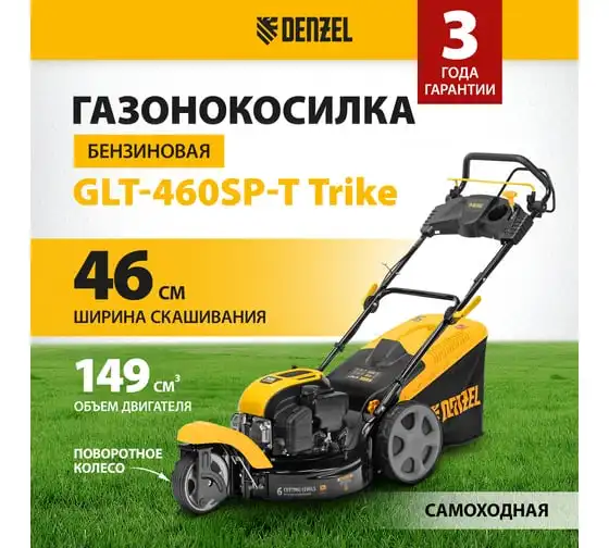 Бензиновая газонокосилка Denzel GLT-460SP-T, Trike 150 см3, 46 см, привод, панель, 60л 58810