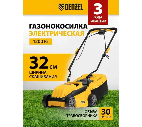 Газонокосилка электрическая Denzel GMC-1200, ширина 32 см, 1200 Вт, 3 уровня, травосборник 30 л, 96628
