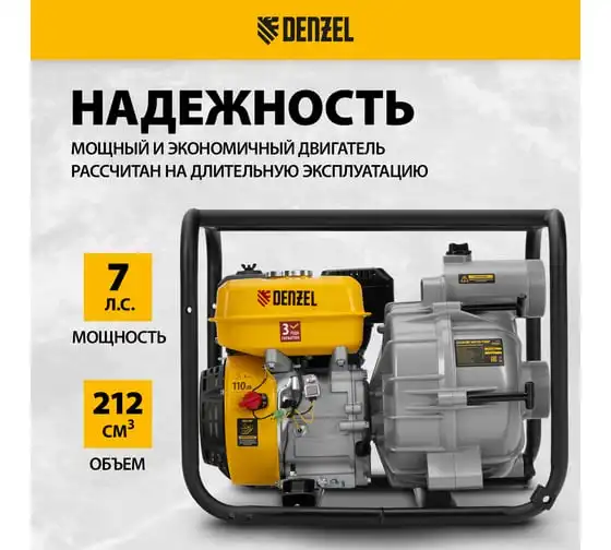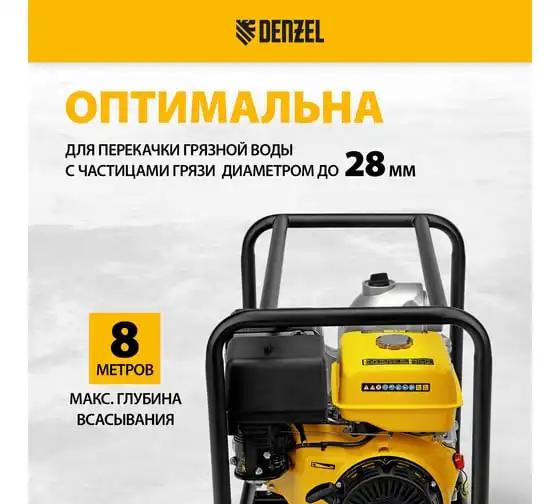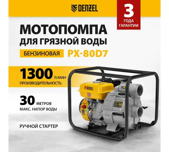Мотопомпа бензиновая для грязной воды Denzel PX-80D7, 7 л.с., 3", 1300 л/мин, глуб 8 м, напор 30 м 99206
