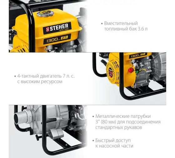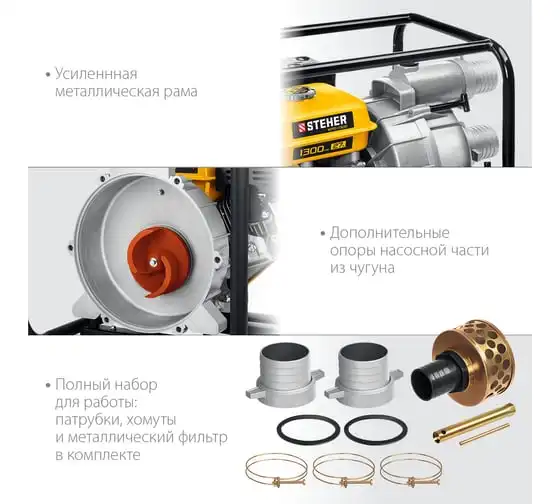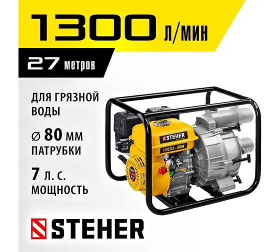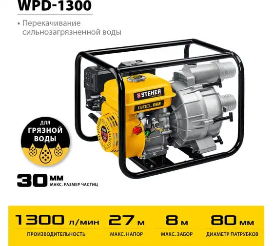 Бензиновая мотопомпа для грязной воды STEHER 1300 л/мин WPD-1300
