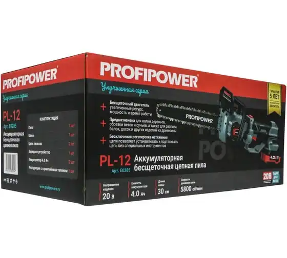 Аккумуляторная бесщеточная цепная пила PROFIPOWER PL-12 с штангой телескопической (20В,12, Li-ion-2шт, 4.0Ач, 0-5800 об/мин,З/У, в коробке) E0285