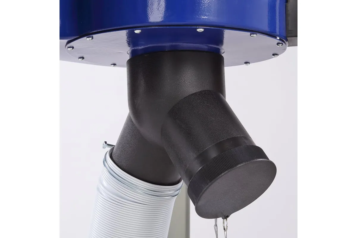 На корпусе расположен патрубок диаметром 125 мм, на него устанавливается адаптер с двумя отводами по 100 мм (идёт в комплекте). Благодаря этому к вытяжной установке BELMASH DC1600М можно подключить 2 станка для отвода стружки.
