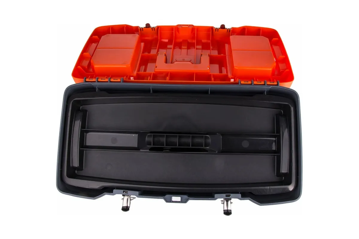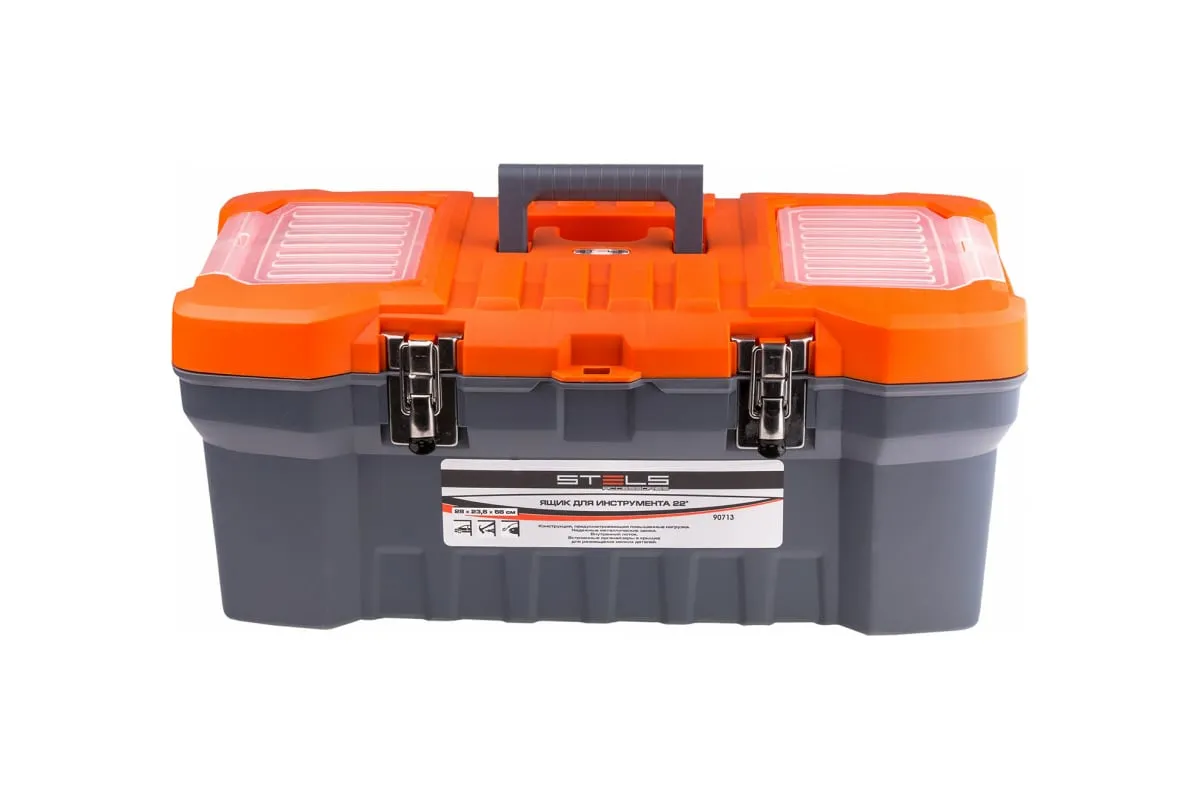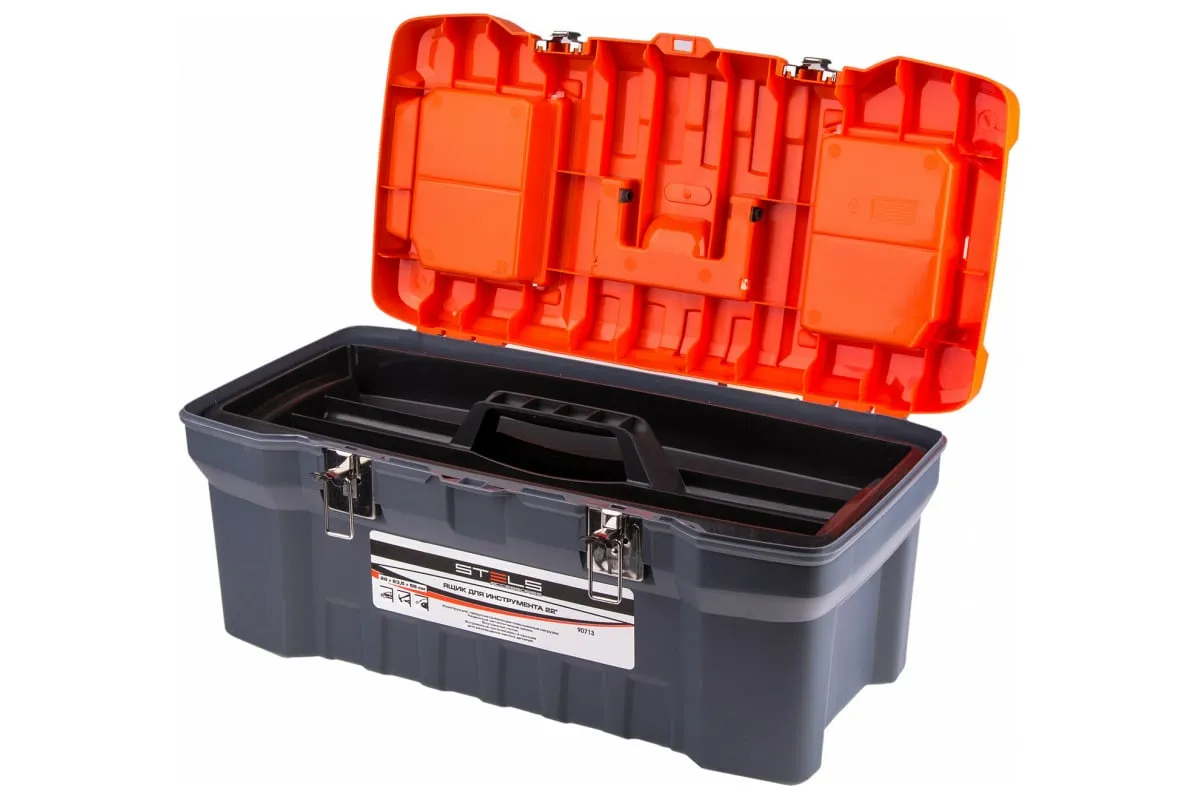 Ящик для инструмента с металлическими замками 22", 280х235х560мм STELS Россия 90713 - прочный и удобный переносной кейс для хранения ручных инструментов, бытовых мелочей, рыболовных снастей и пр. Изделие изготовлено из качественного пластика и усилено металлическими замками.