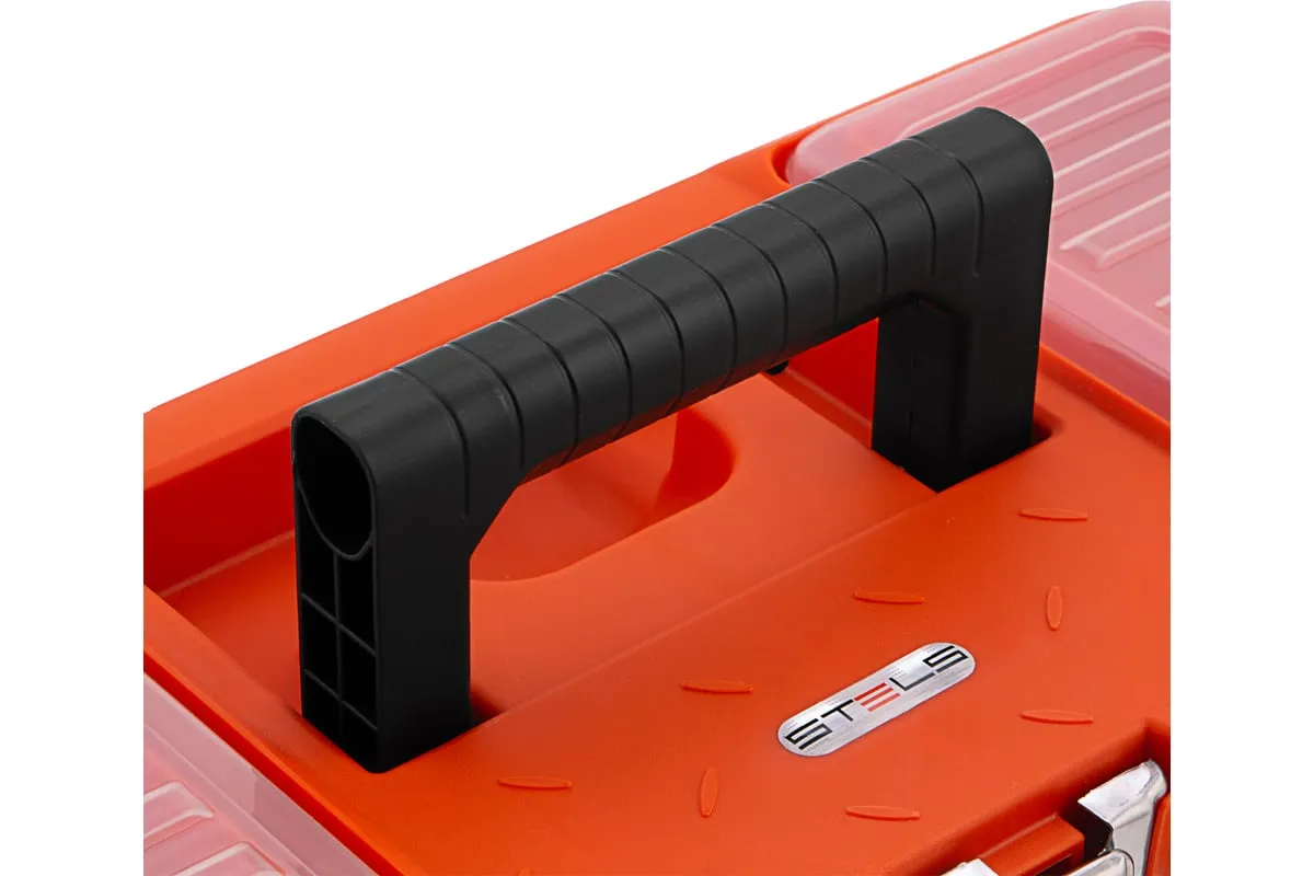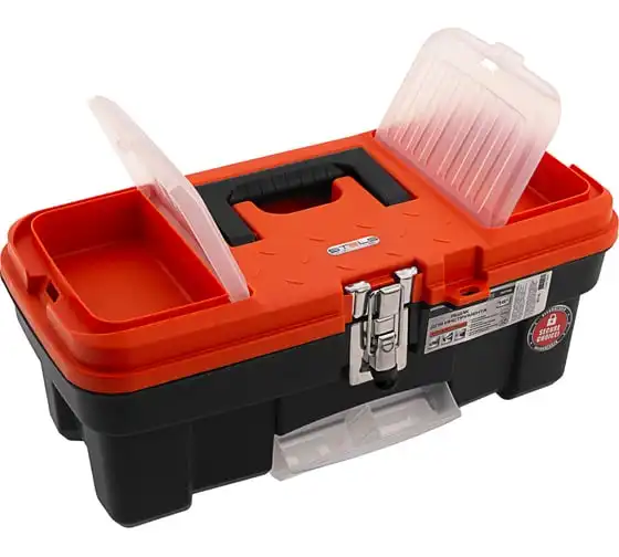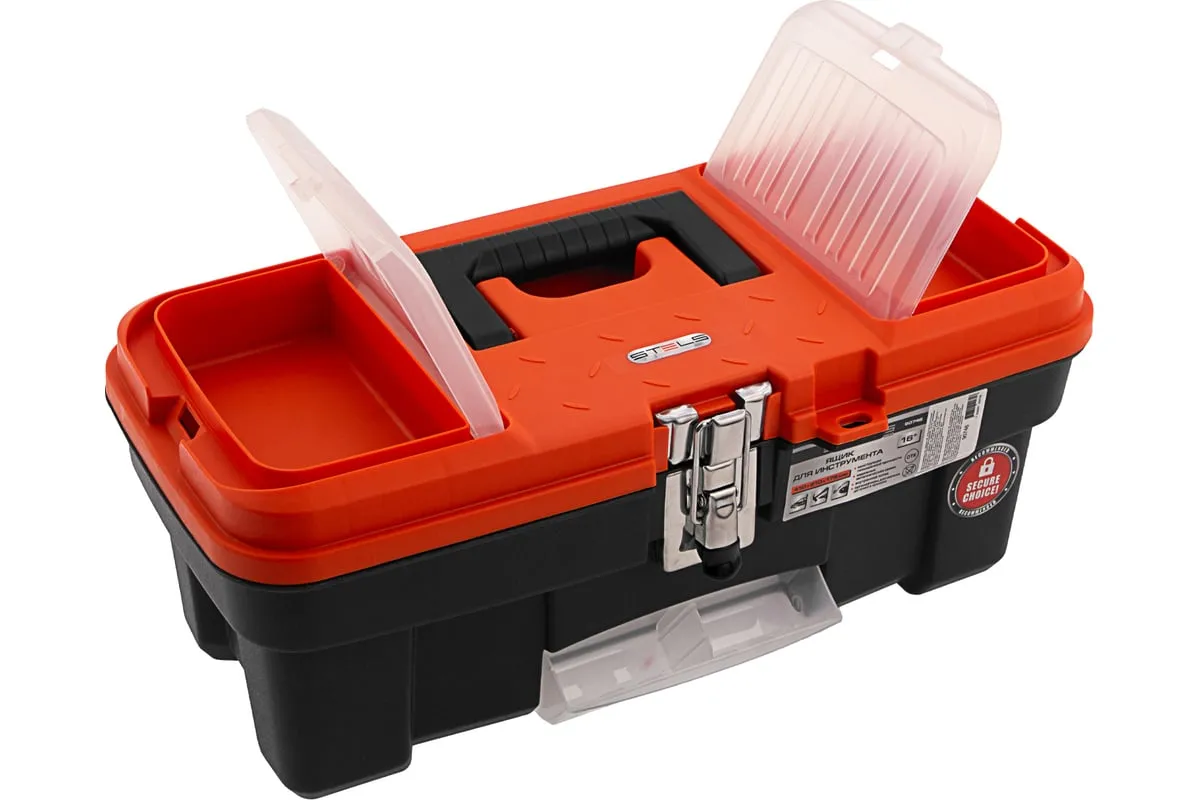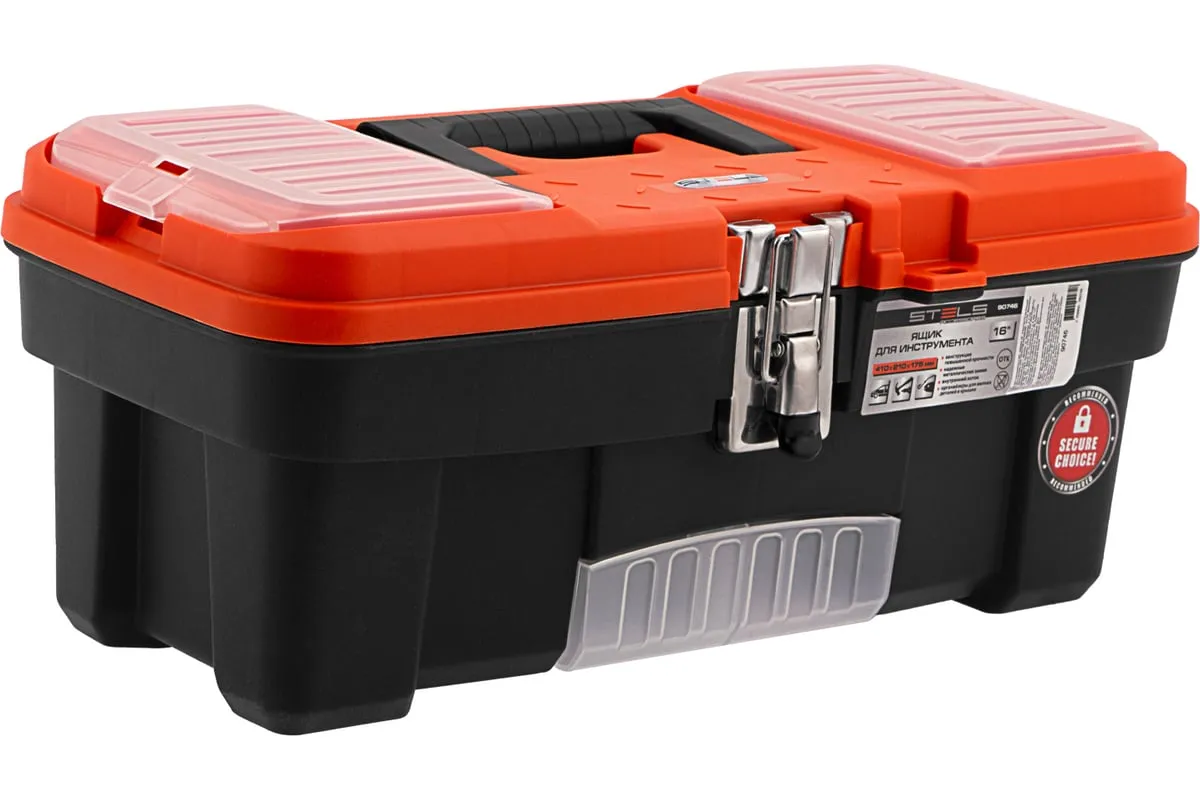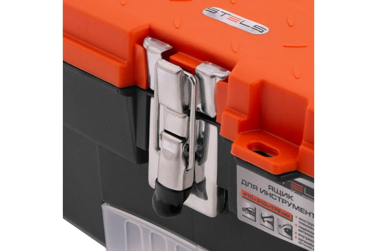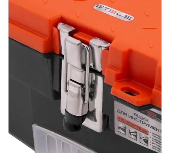 Ящик для инструмента с металлическими замками STELS 16", 410x210x175 мм 90746 — альтернатива коробке для инструментов. В нем можно расположить ручной инструмент, крепежи, хозяйственные мелочи, а также рыболовные снасти.