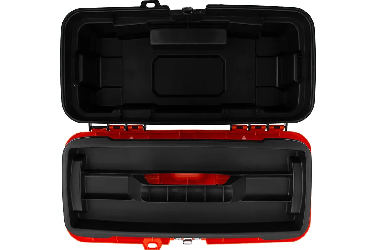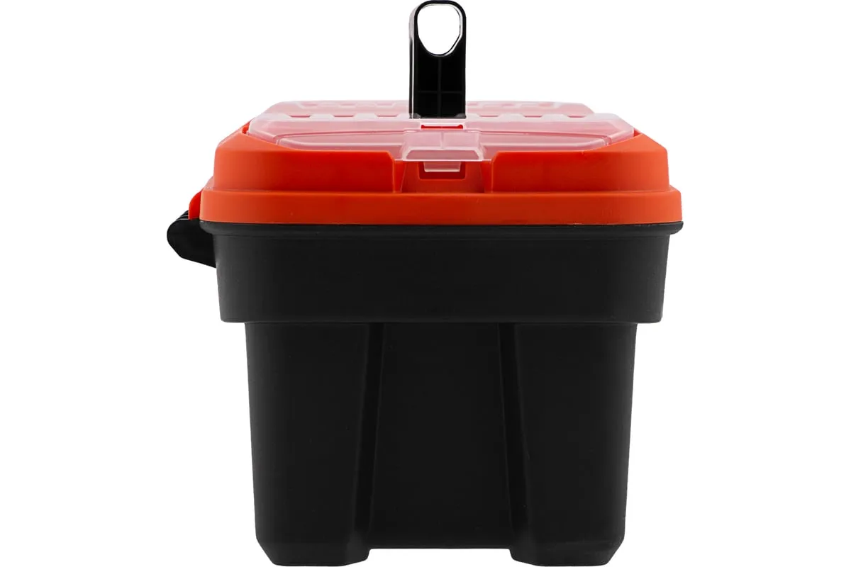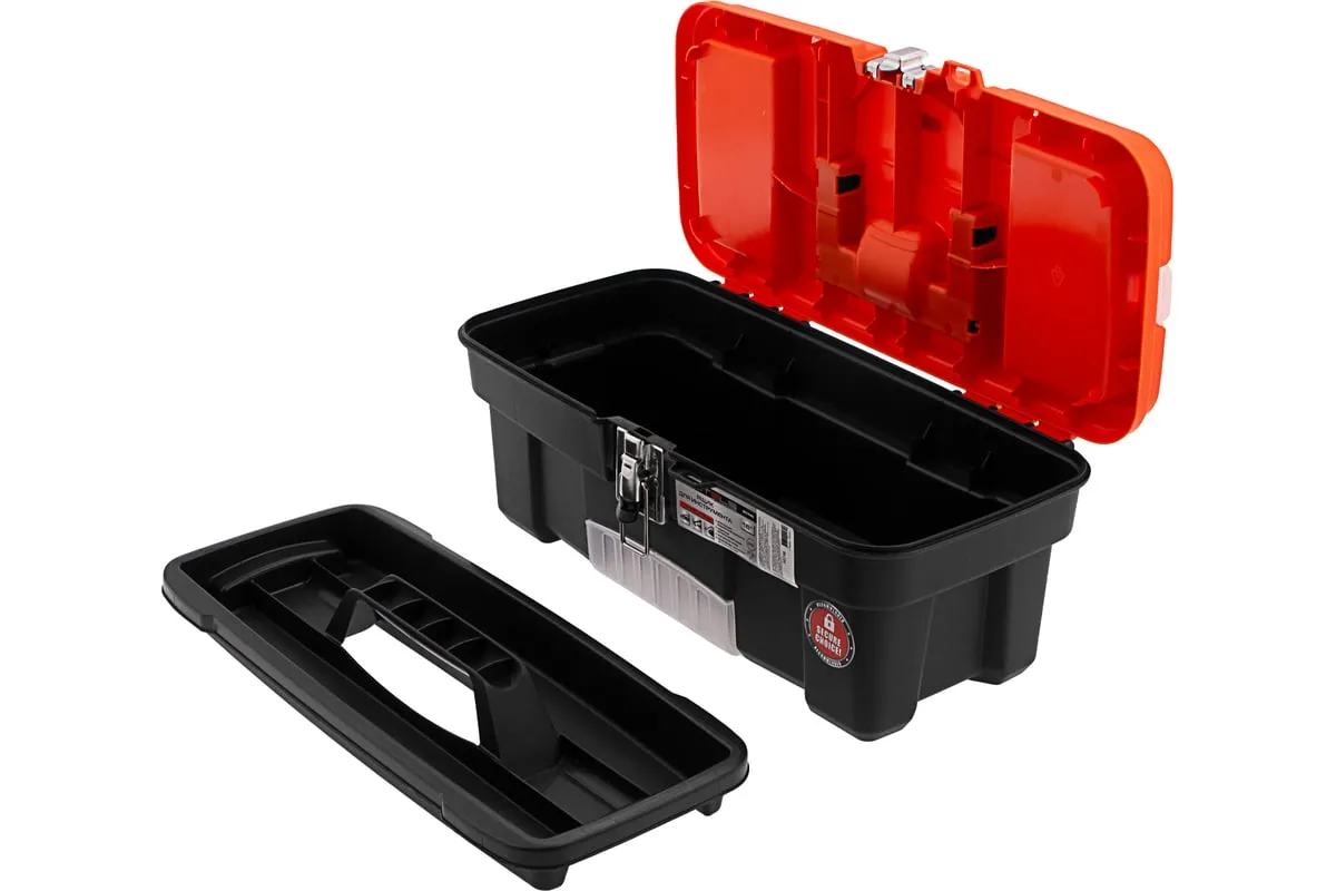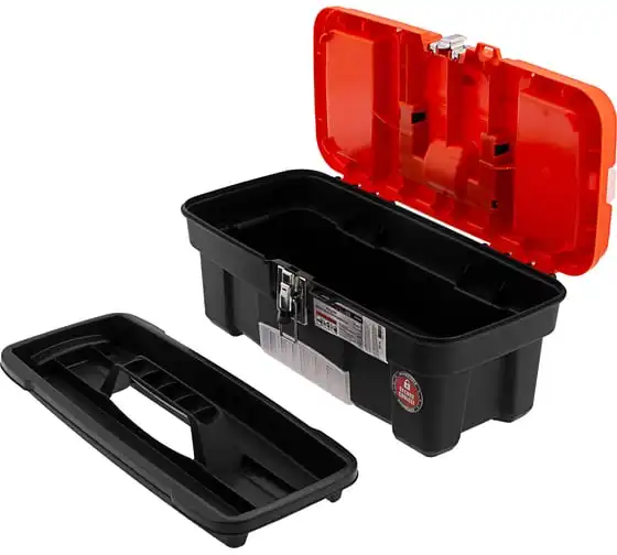 В крышке имеются встроенные органайзеры, на дне - выкидной лоток с отсеками для мелких деталей, что увеличивает функциональность ящика. Его удобно брать в поездки, также ящик пригодится дома, на даче или в гараже.