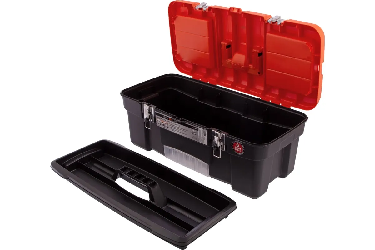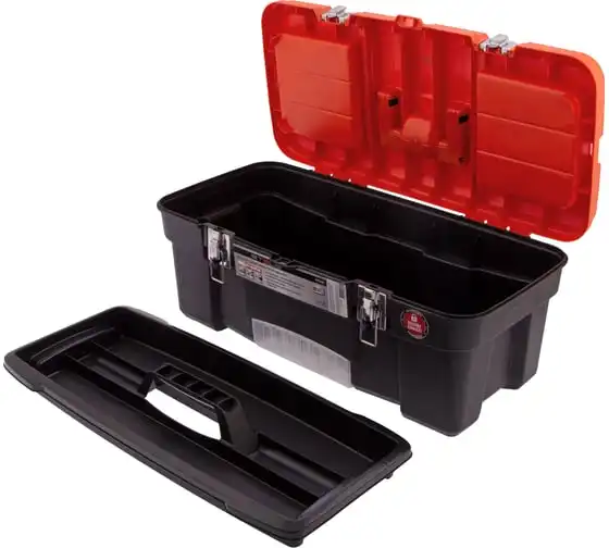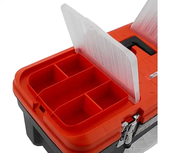 В крышке имеются встроенные органайзеры, на дне - выкидной лоток с отсеками для мелких деталей, что увеличивает функциональность ящика. Его удобно брать в поездки, также ящик пригодится дома, на даче или в гараже.