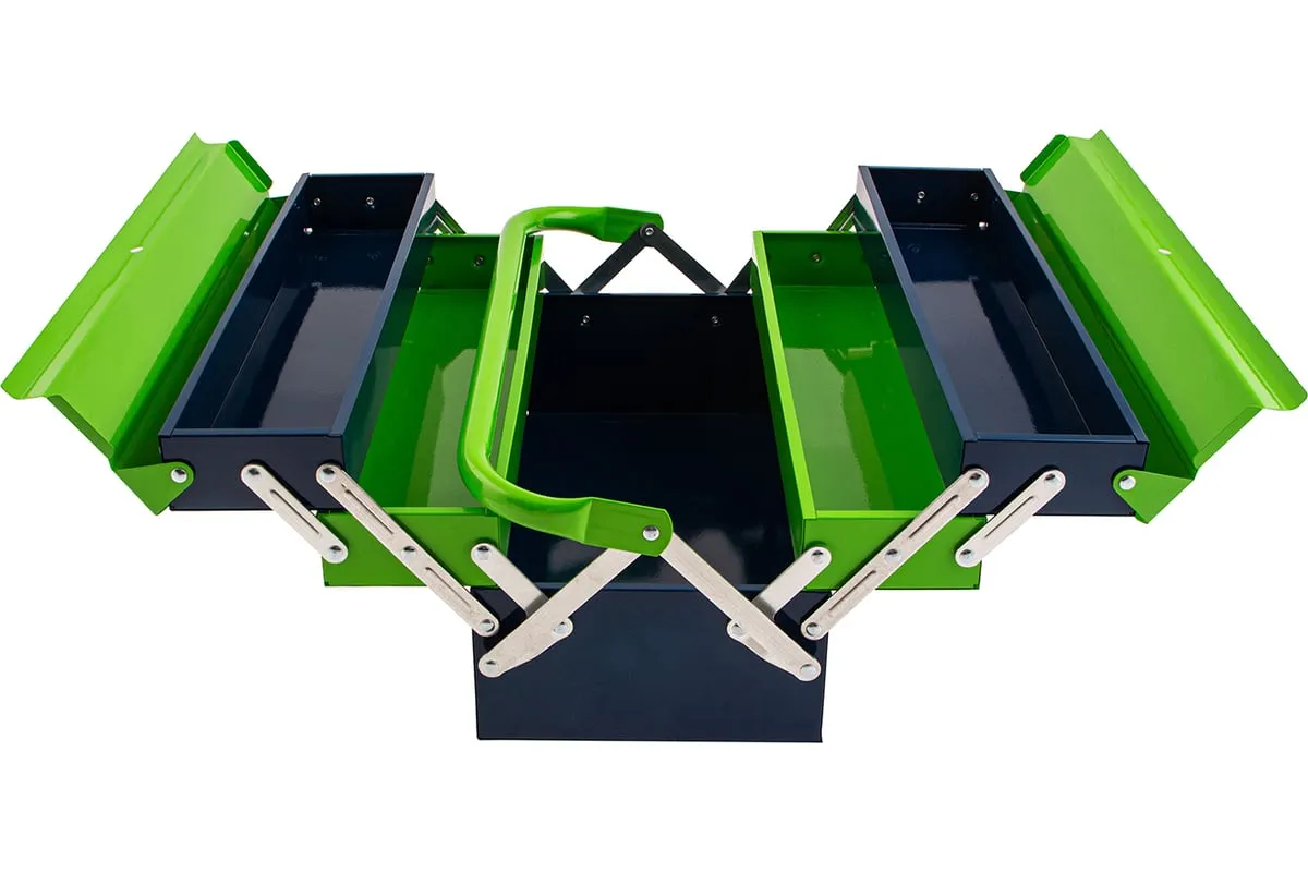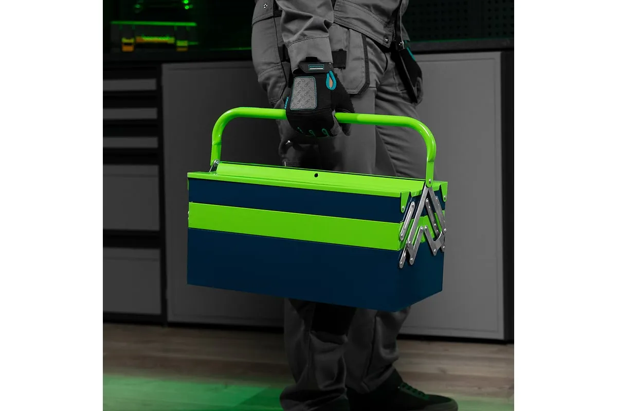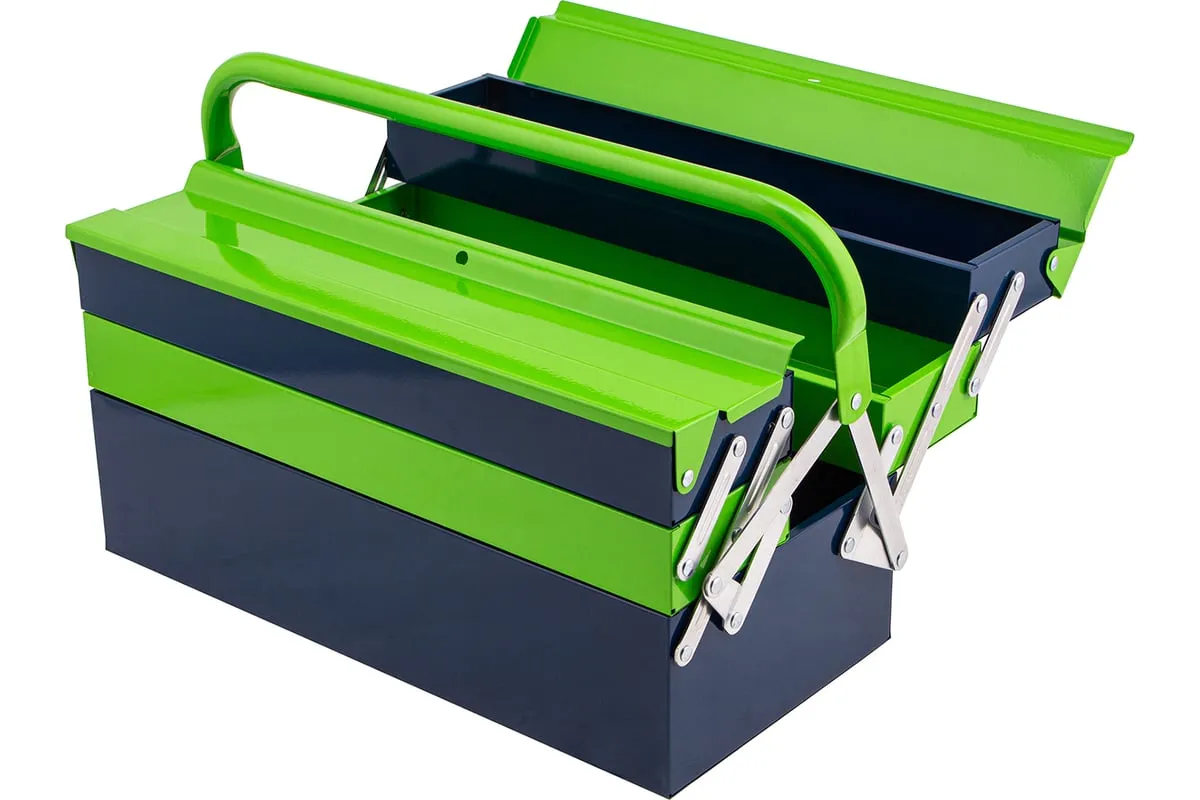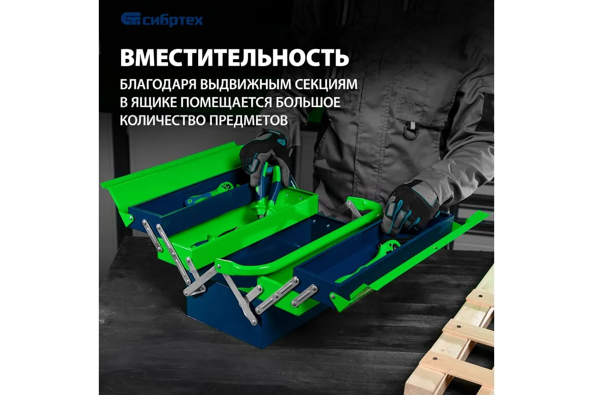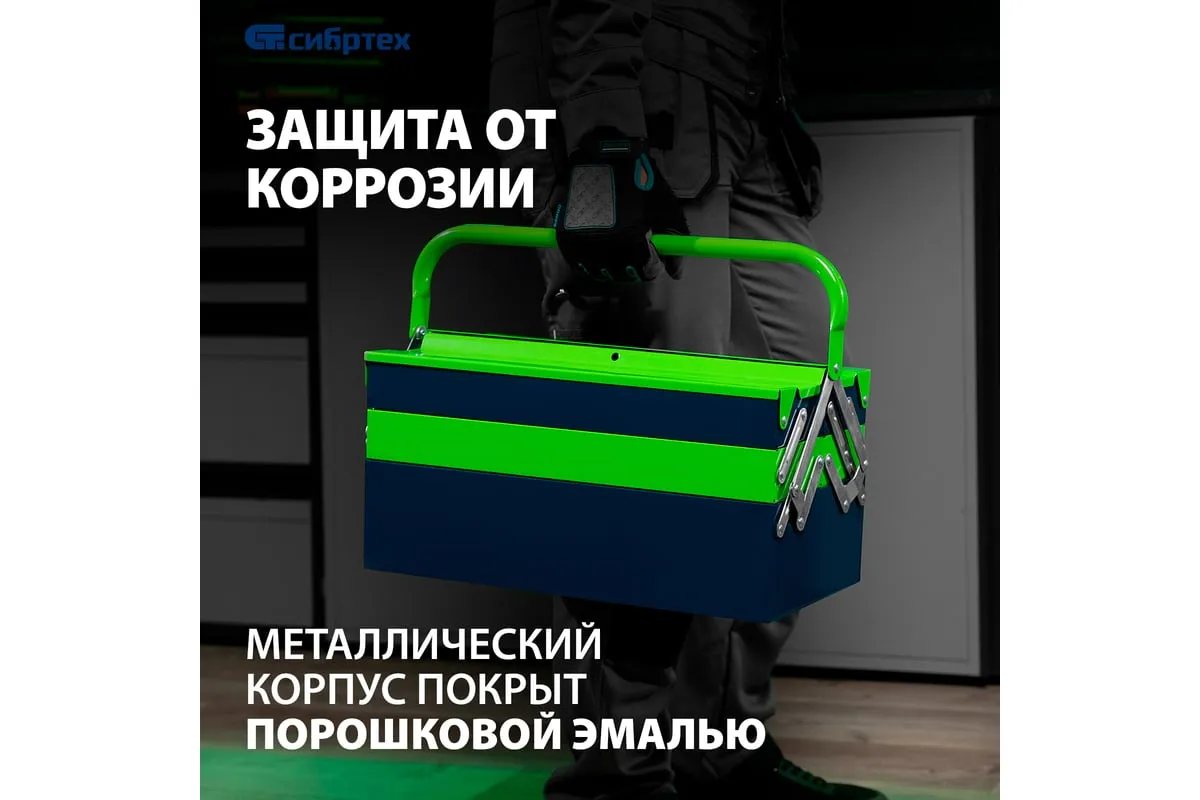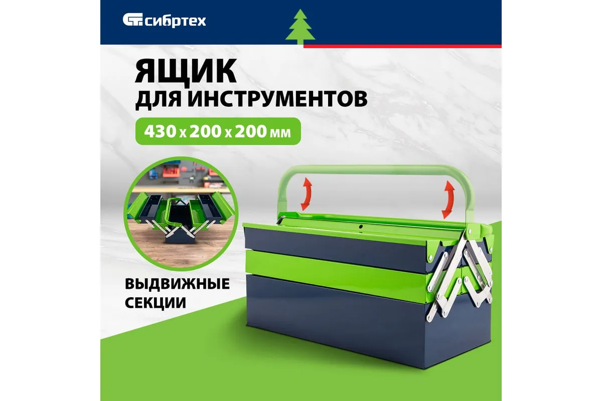 Металлический ящик Сибртех 90751 размером 430 х 200 х 200 мм, с пятью секциями, используется для размещения инструментов, хозяйственных мелочей, крепежных элементов или рыболовных принадлежностей. Предметы удобно раскладываются по отделениям, что обеспечивает порядок во время их хранения и транспортировки. Ящик пригодится в поездке, на рыбалке, а также дома, на даче или в гараже.