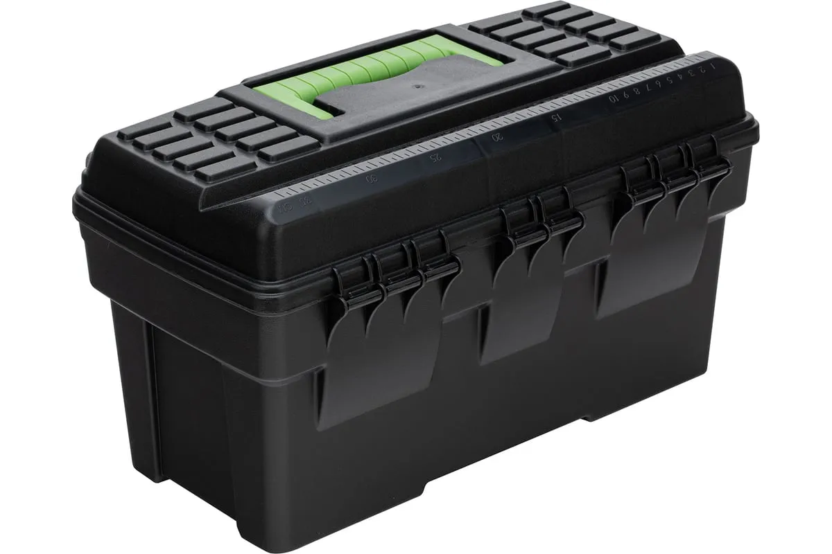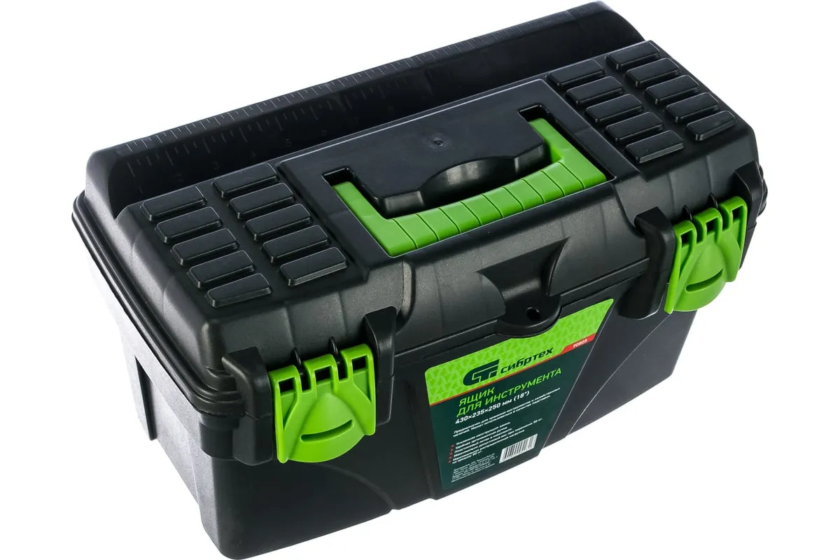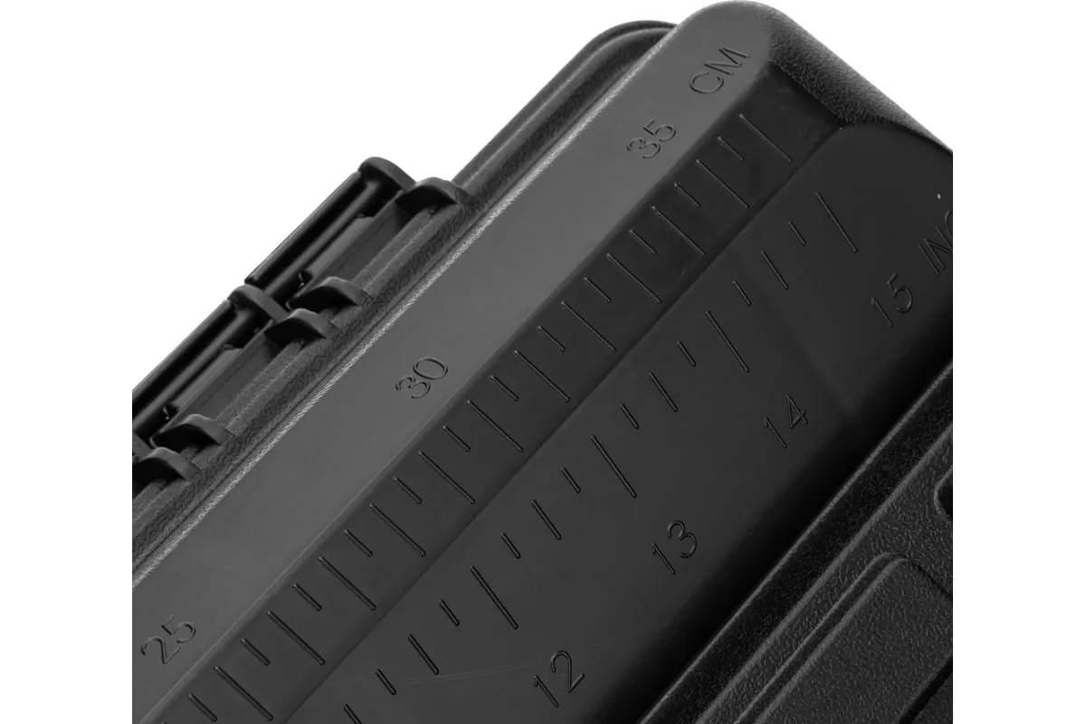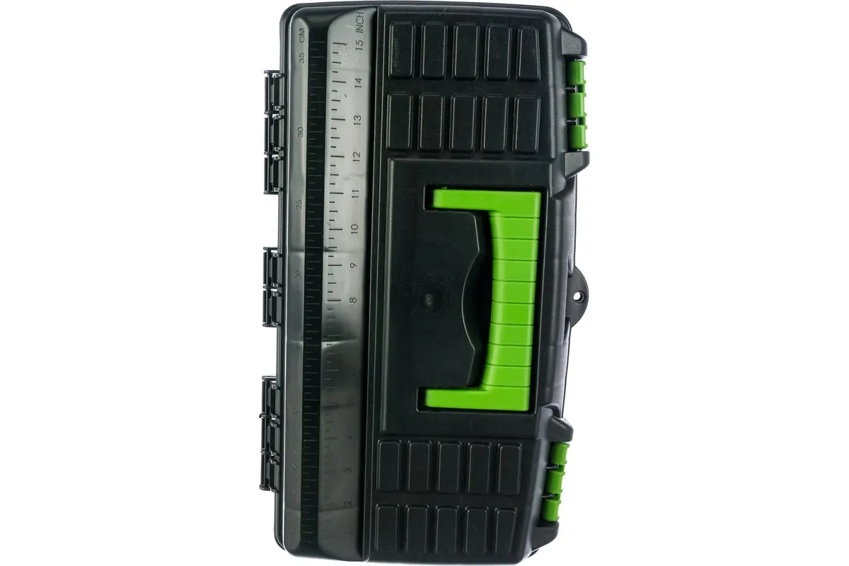Ящик для инструмента Сибртех 90805 из пластика, размером 430 х 235 х 250 мм (длина 18"), — удобное вместилище для инструментов, бытовых мелочей, рыболовных снастей. На крышку нанесена измерительная шкала в сантиметрах и дюймах, поэтому можно проводить измерения, даже если под рукой нет линейки. Ящик пригодится в поездке, на рыбалке, а также дома, на даче или в гараже.