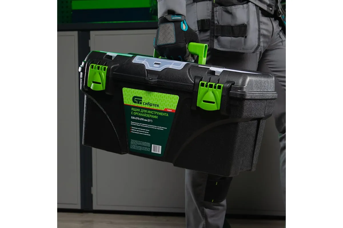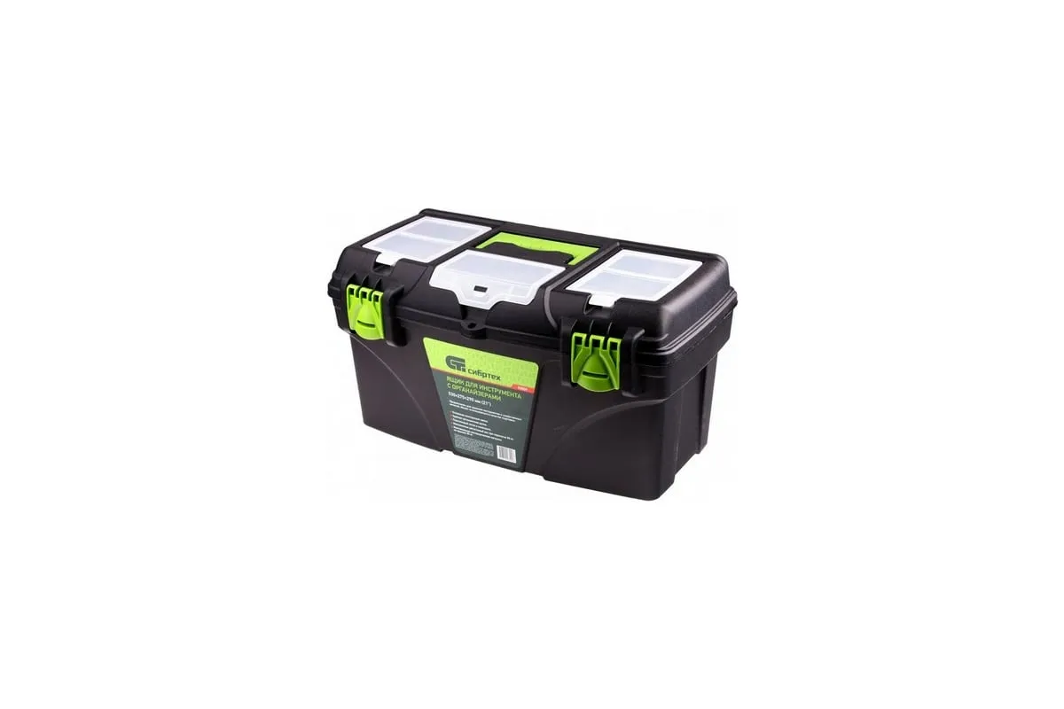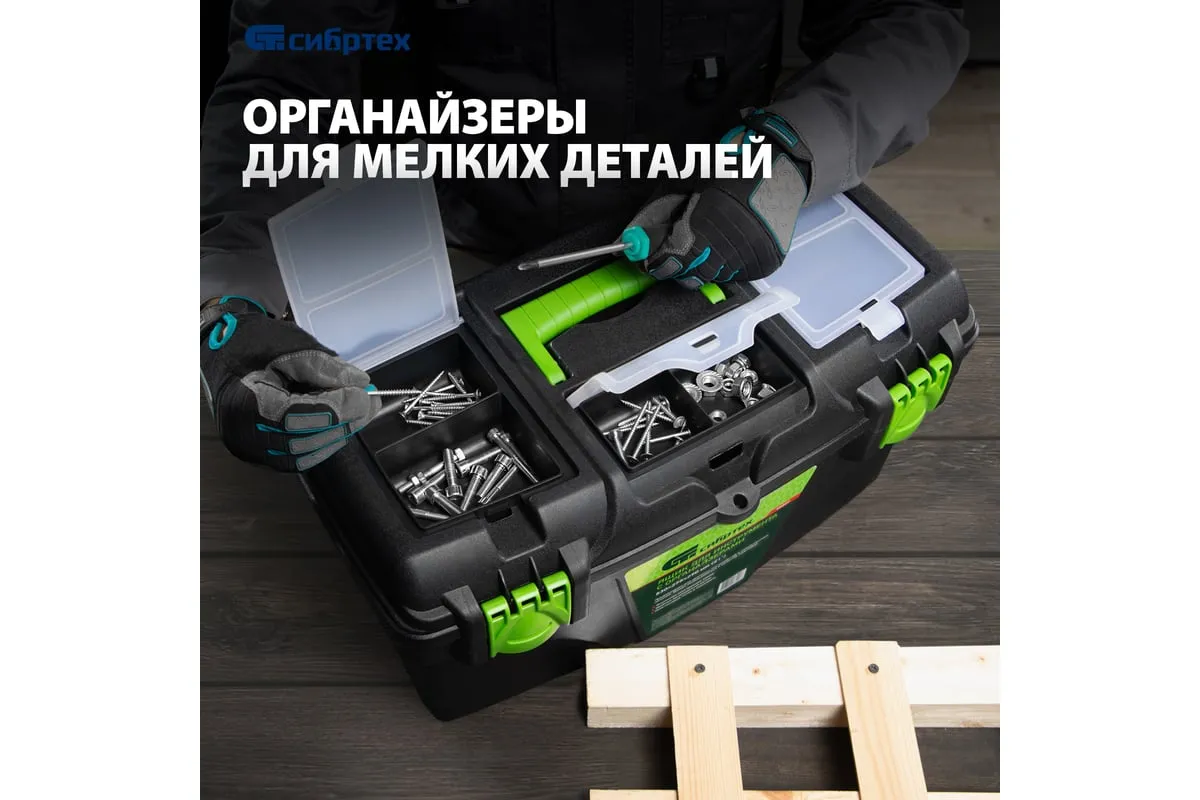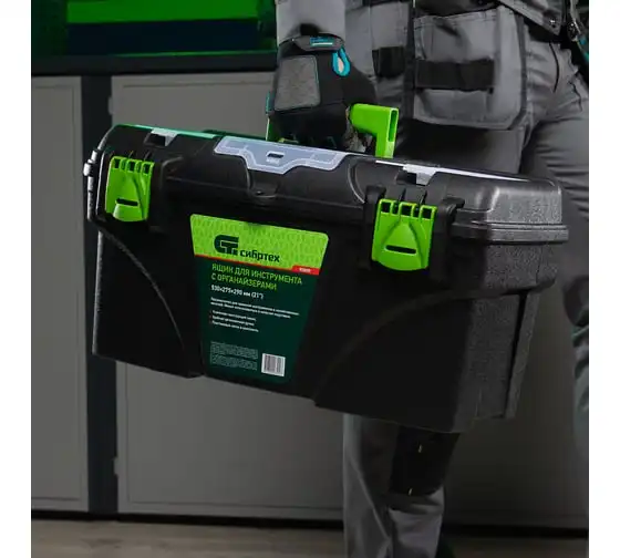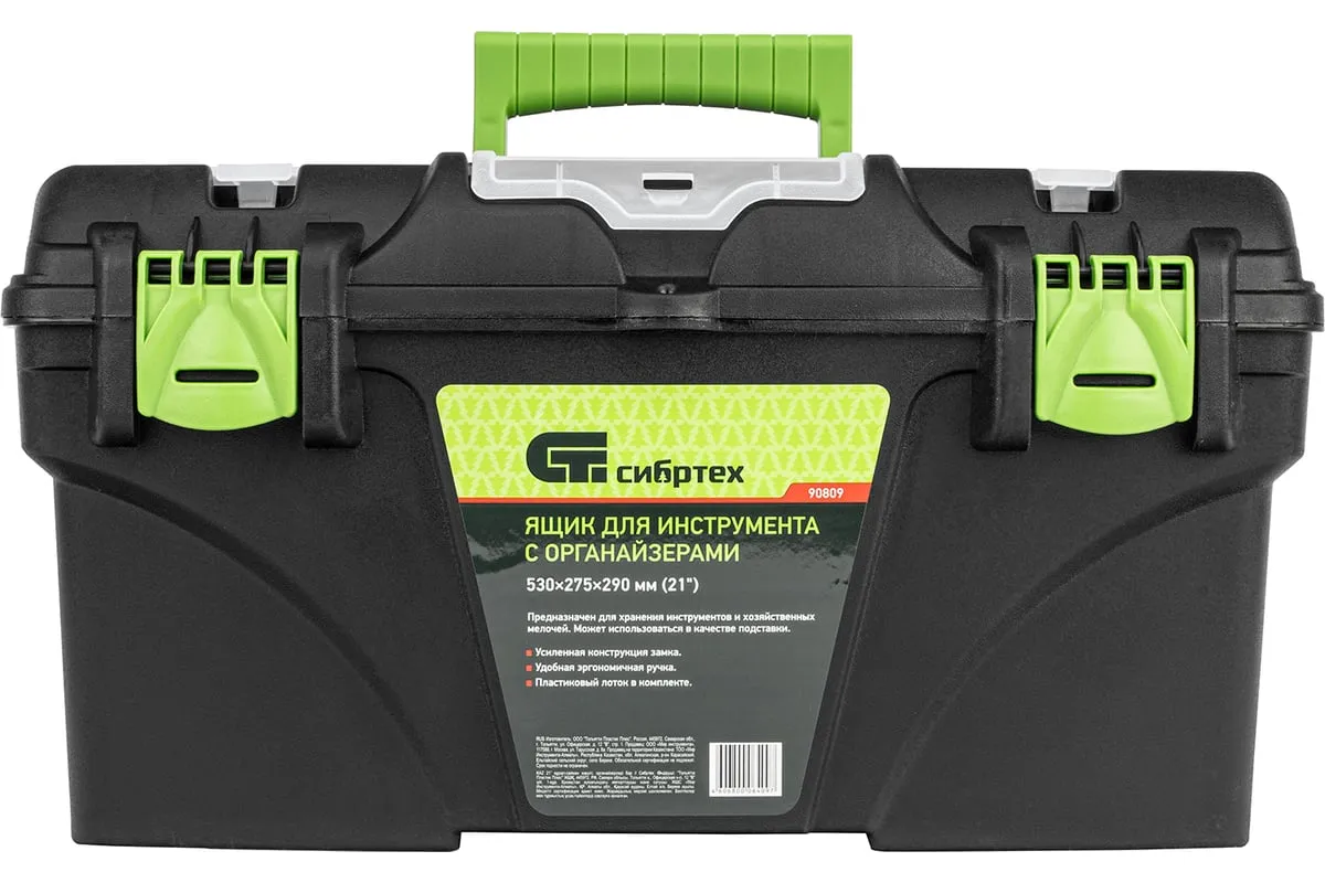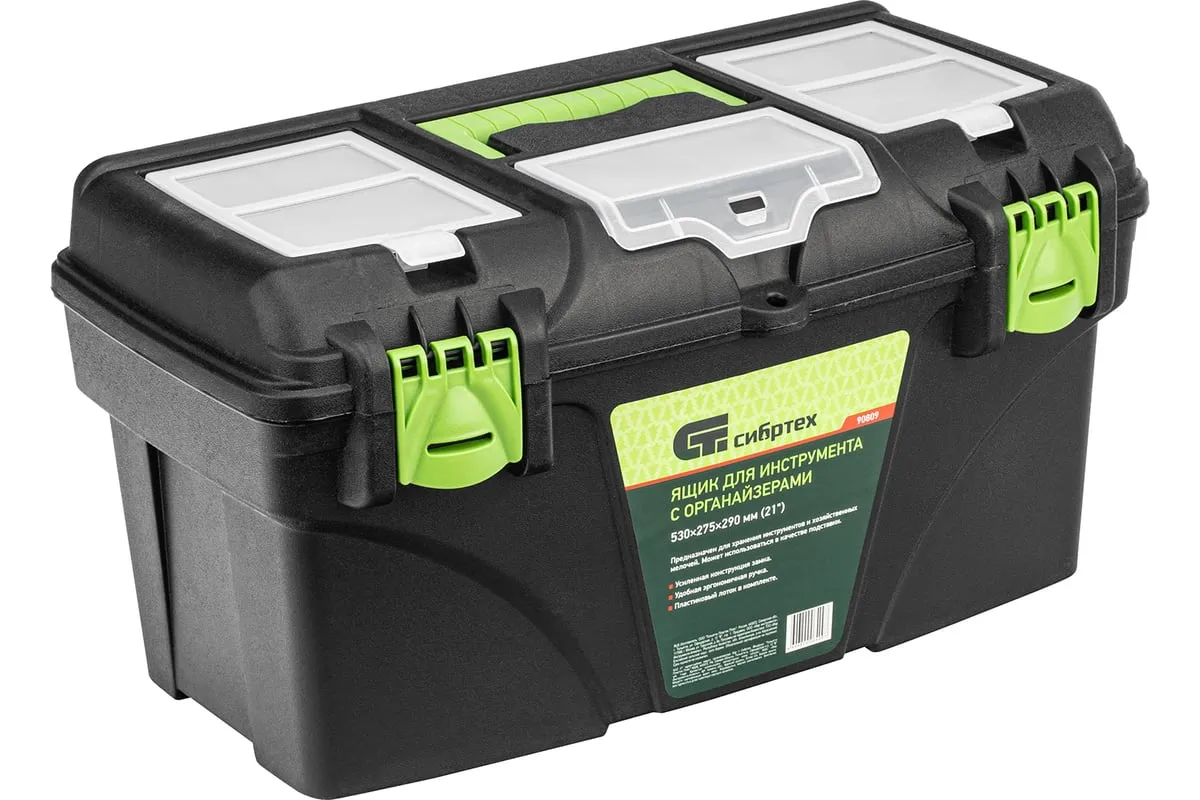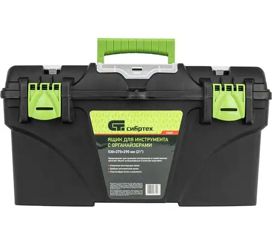 Ящик Сибртех 90809, 21 дюйм, с органайзерами, используется для хранения и транспортировки инструментов, оснастки, крепежей, хозяйственных мелочей и других предметов. Крышка и замок усилены трехрядными петлями, поэтому он выдерживает вес содержимого до 50 кг. Ящик можно брать в поездку, также он пригодится дома, на даче или в гараже.