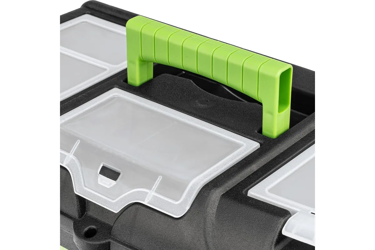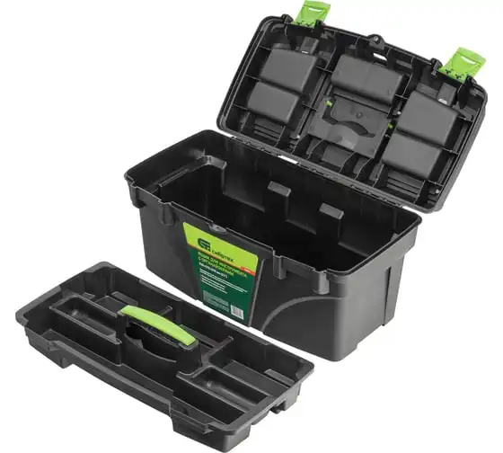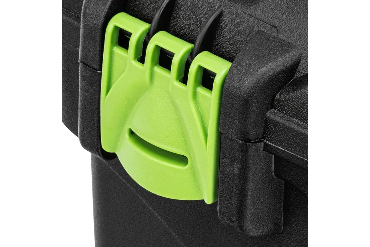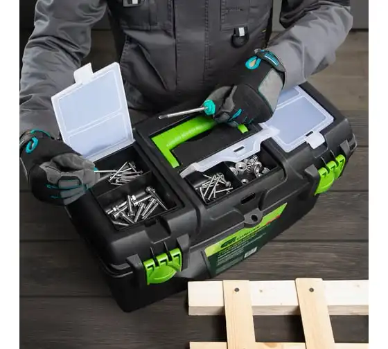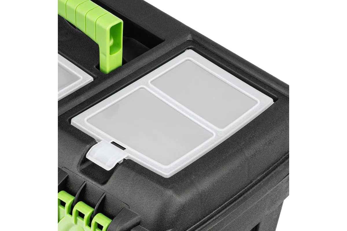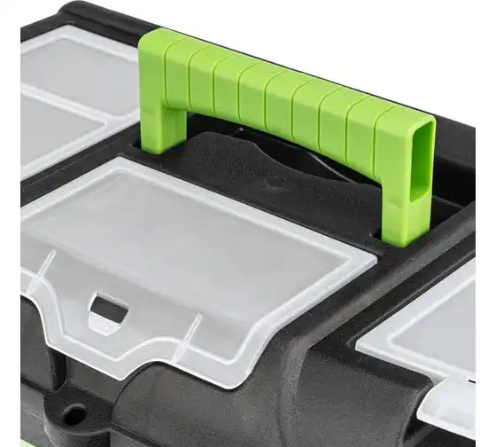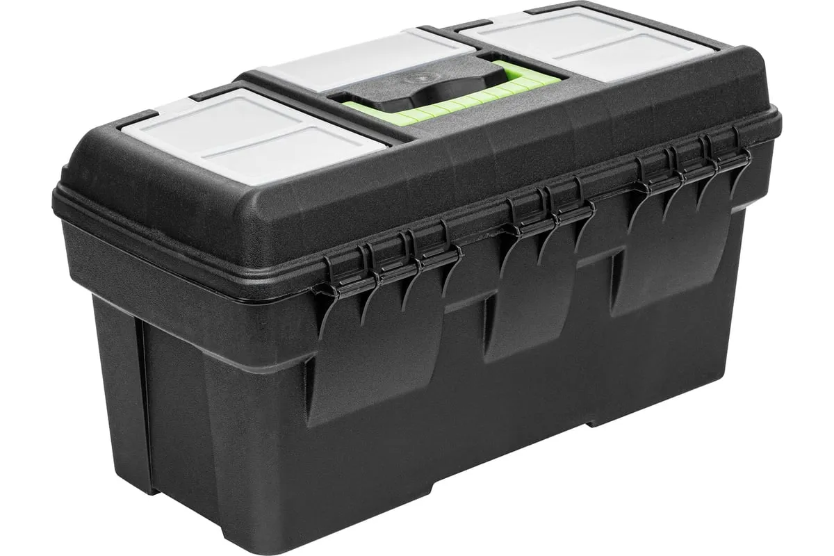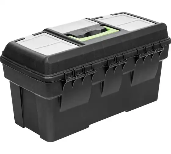 Ящик Сибртех 90809, 21 дюйм, с органайзерами, используется для хранения и транспортировки инструментов, оснастки, крепежей, хозяйственных мелочей и других предметов. Крышка и замок усилены трехрядными петлями, поэтому он выдерживает вес содержимого до 50 кг. Ящик можно брать в поездку, также он пригодится дома, на даче или в гараже.