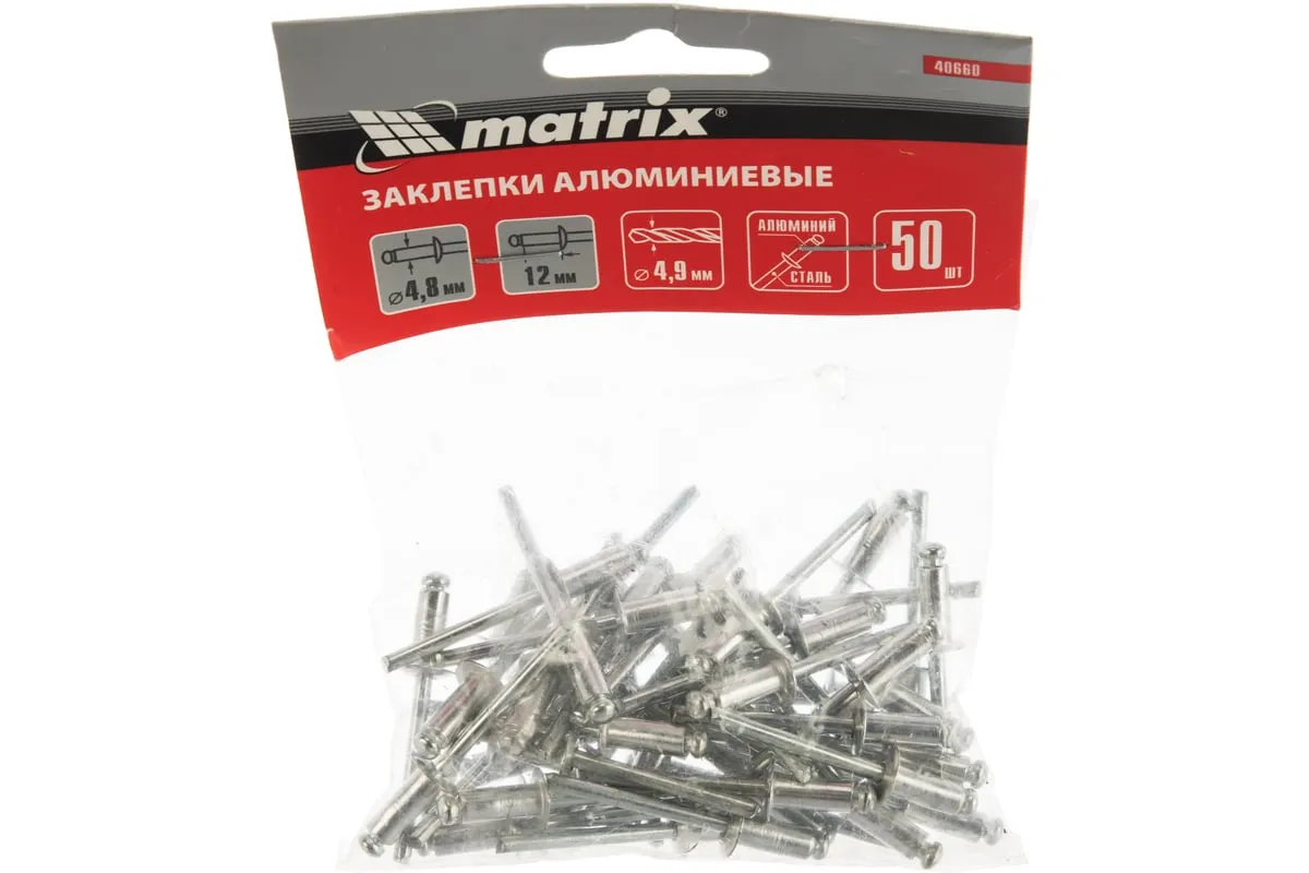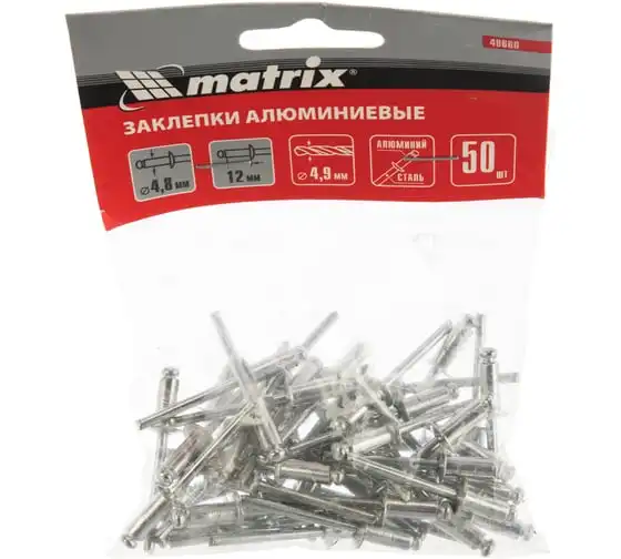 Заклепки Matrix 40660, 4,8 х 12 мм, 50 шт., предназначены для соединения листовых заготовок. Обеспечивают надежную фиксацию материалов даже при наличии доступа только с одной стороны. Используются в строительстве домов, при возведении заборов из профлиста, производстве оборудования, будут полезны в домашней мастерской.