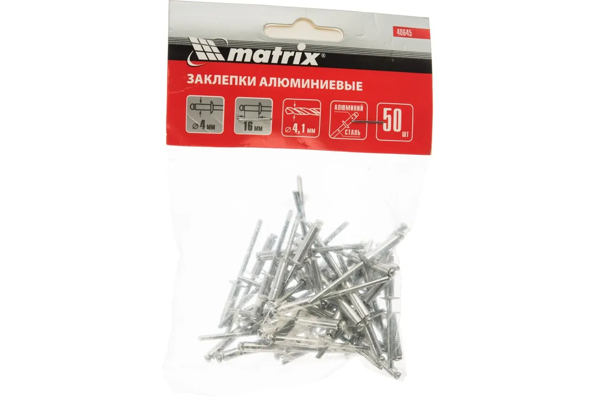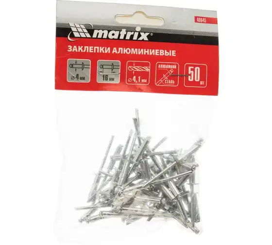 Заклепки Matrix 40645, 4,0 х 16 мм, 50 шт., предназначены для соединения листовых заготовок. Обеспечивают надежную фиксацию материалов даже при наличии доступа только с одной стороны. Используются в строительстве домов, при возведении заборов из профлиста, производстве оборудования, будут полезны в домашней мастерской.