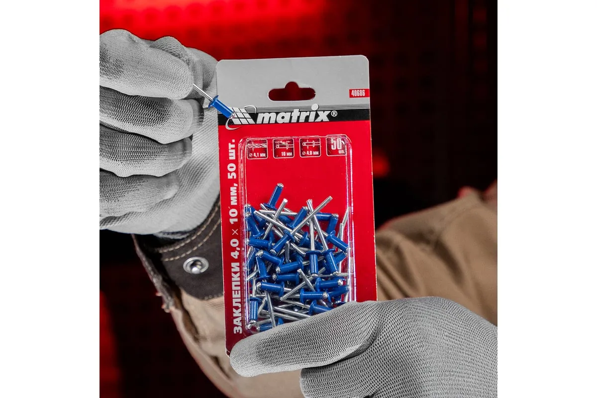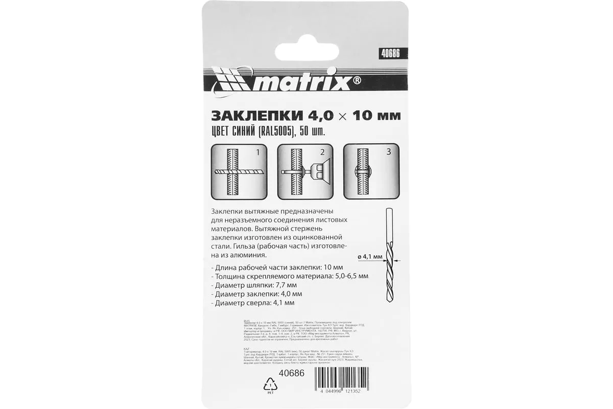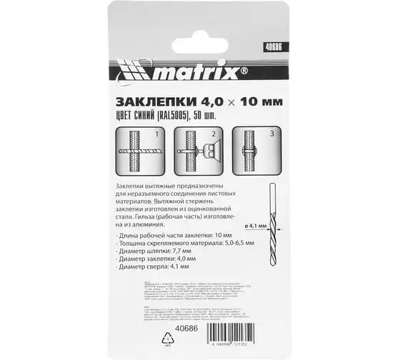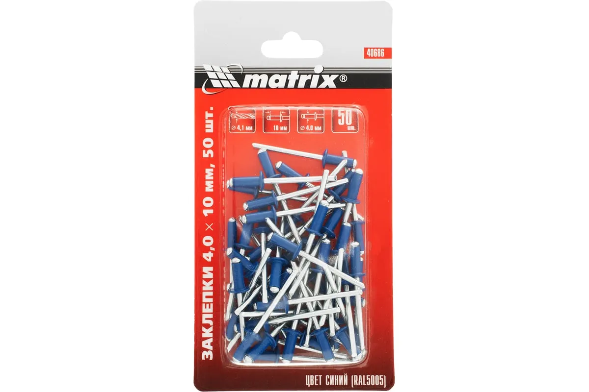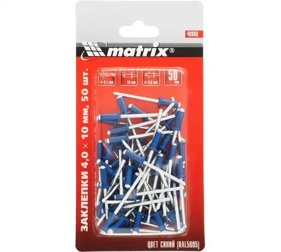 Заклепки RAL 5005 MATRIX 40686 применяются для скрепления между собой листовых материалов из металла, древесины, пластмассы, кожи. Устанавливаются в отверстие, после чего расклепываются со стороны стержня, образуя прочное соединение. Вытяжной стержень заклепки изготовлен из оцинкованной стали. Гильза выполнена из алюминия.