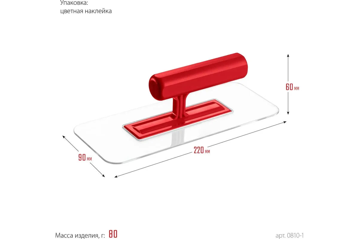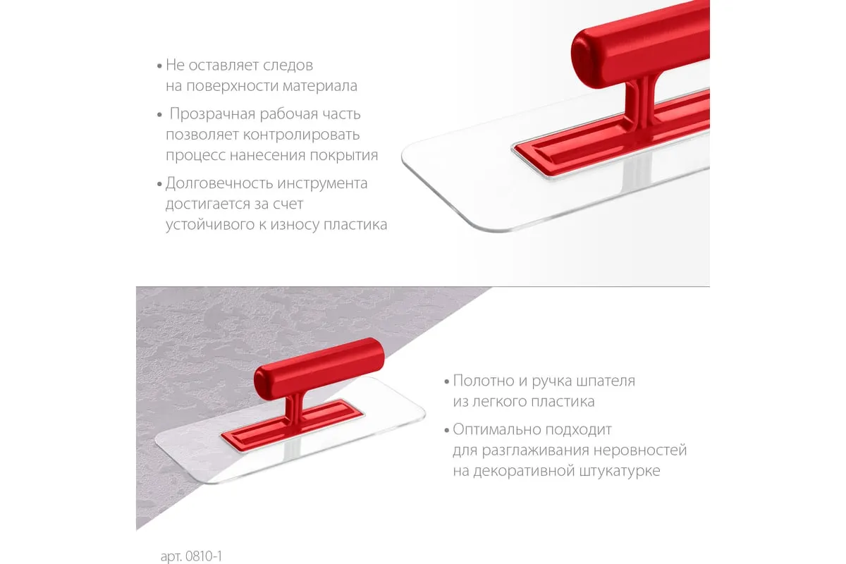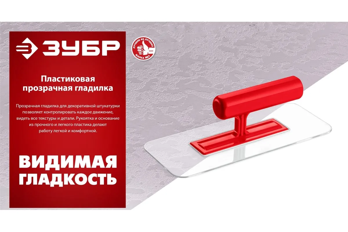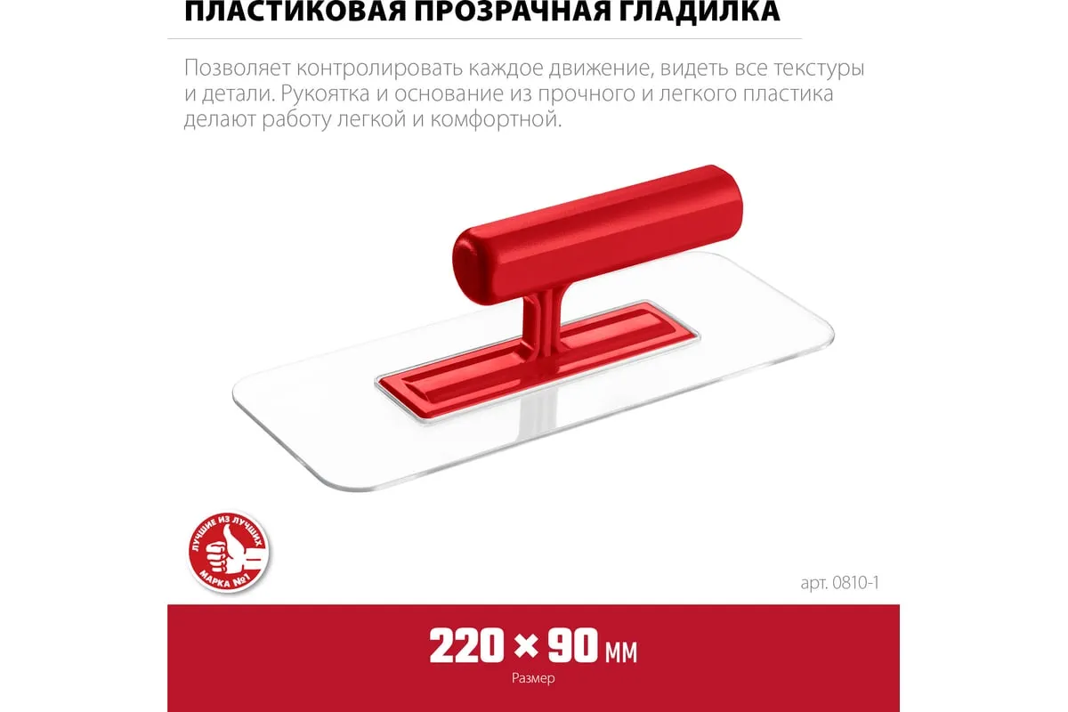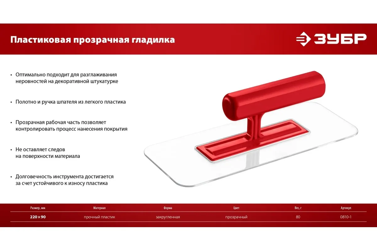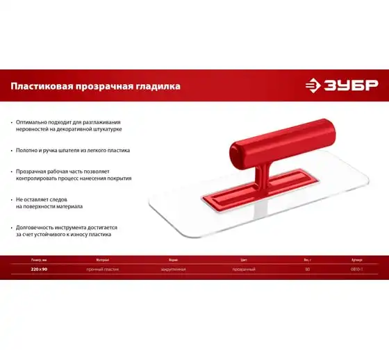 ЗУБР 220x90 мм, закругленная, прозрачная, штукатурная пластиковая гладилка 0810-1 - это инструмент, используемый для нанесения и распределения различных растворов по стенам, полу и потолку. Кроме этого, с её помощью сглаживаются швы и большие неровности. Изготовлена из ударопрочной пластмассы, которая позволяет добиться не только высокой эластичности полотна и ручки, но и повысить прочность всей конструкции в целом. Особенность конструкции - прозрачное полотно, позволяющее видеть текстуру наносимой штукатурки