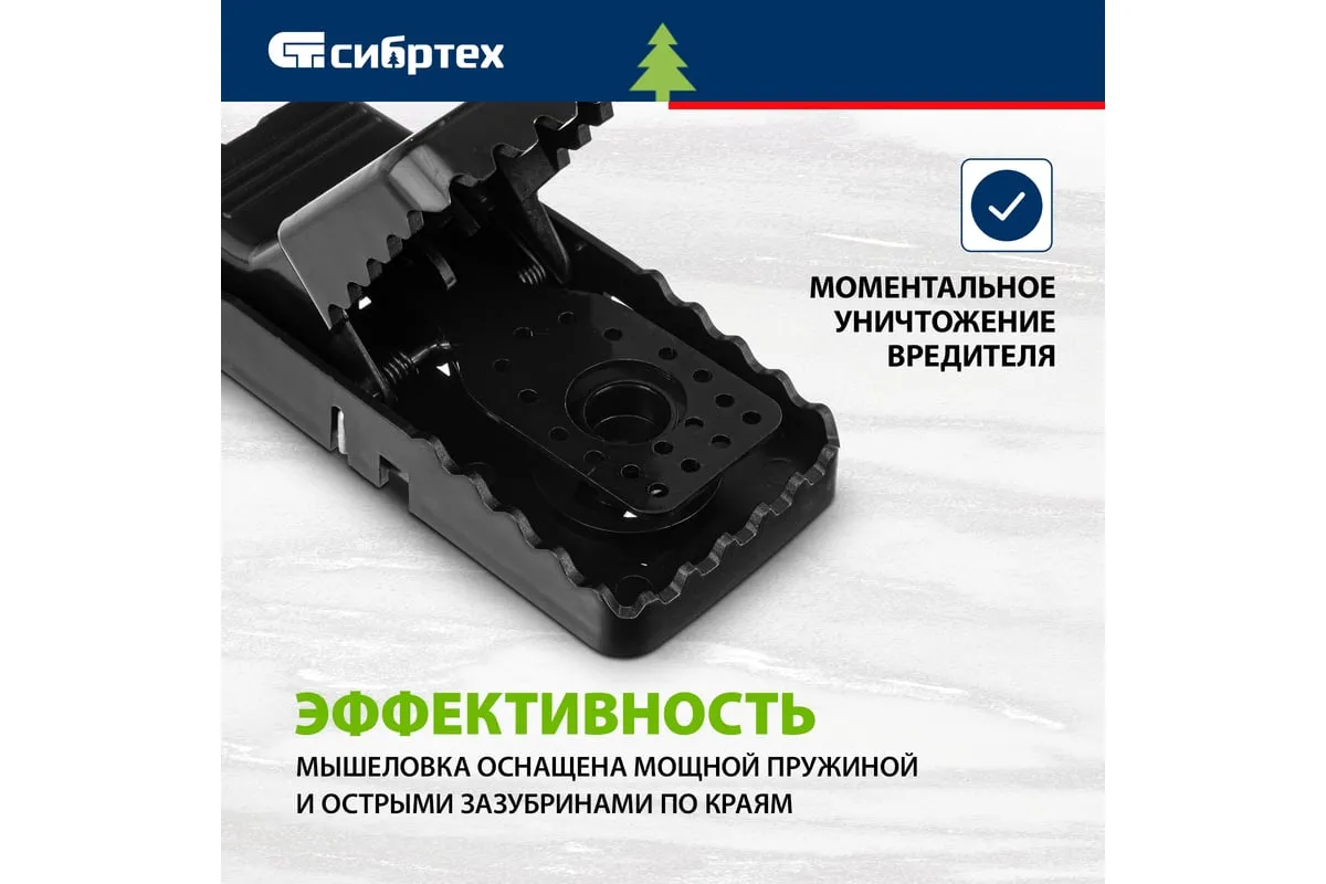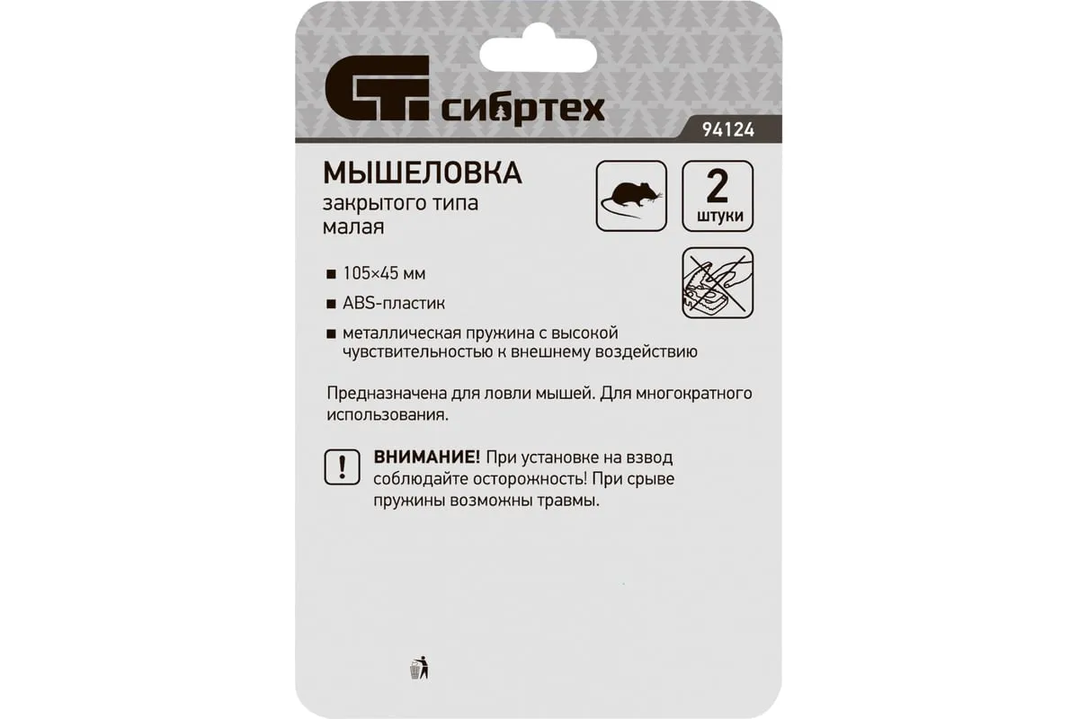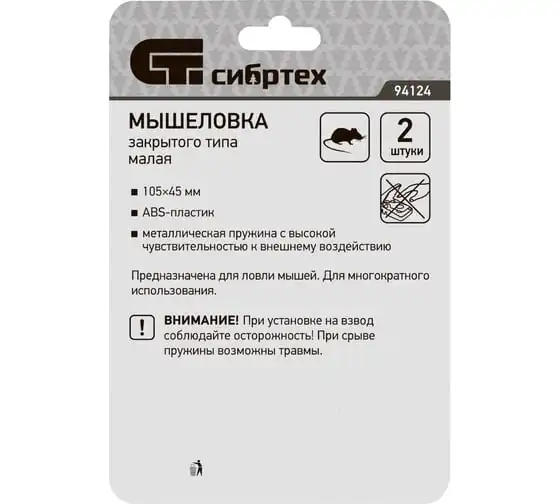 Малая пластиковая мышеловка Сибртех 94124 закрытого типа, размером 105 х 45 мм, входит в набор из 2 шт. и позволяет избавиться от нежелательного присутствия грызунов. Простой и надежный механизм исключает возможность осечки. Мышеловка сконструирована по принципу прищепки и приводится в рабочее состояние одним нажатием.