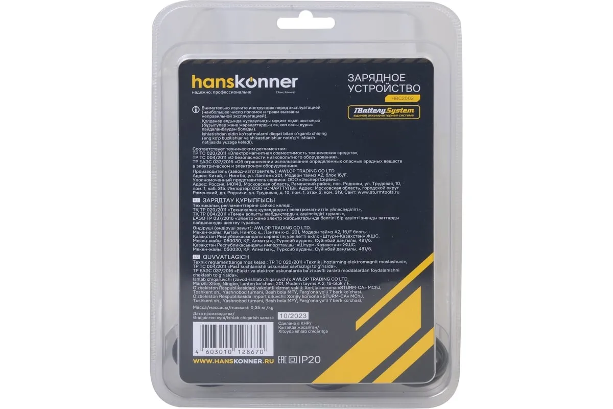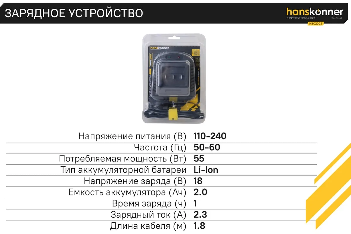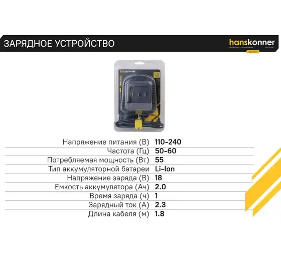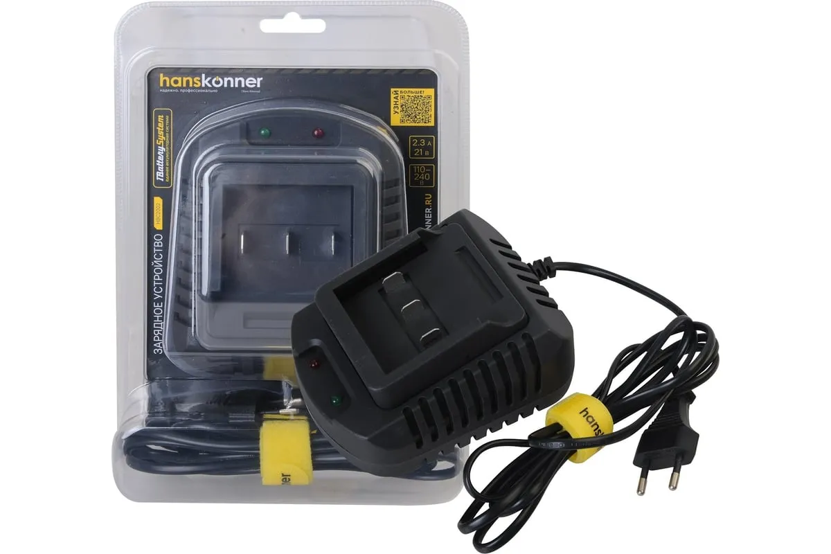 Зарядное устройство HBC2002 Hanskonner для аккумуляторов системы 1BatterySystem. 1BatterySystem - универсальная аккумуляторная система объединяющая инструменты для строительства, ремонта, ухода за садом и т.д. Подходит ко всей линейке аккумуляторного инструмента Hanskonner с логотипом 1BatterySystem. Данное зарядное устройство позволяет зарядить аккумулятор емкостью 2.0 Ач за 1ч или зарядить на 60% за 20 мин.