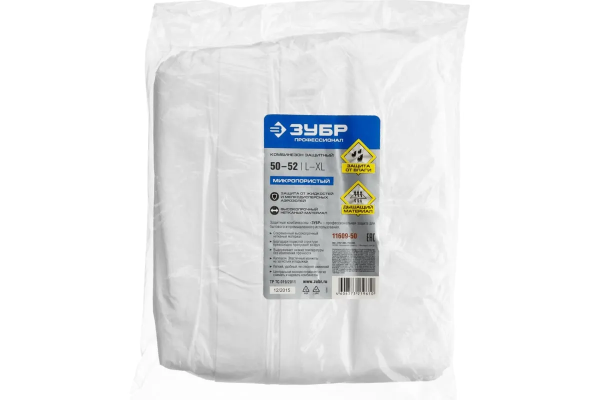 Защитный комбинезон Зубр ПРОФЕССИОНАЛ р. 50-52 11609-50 защищает одежду от общих производственных загрязнений и брызг не разъедающих жидкостей.