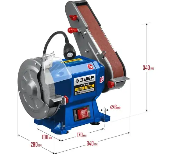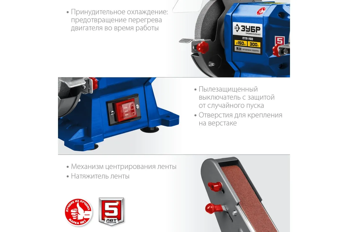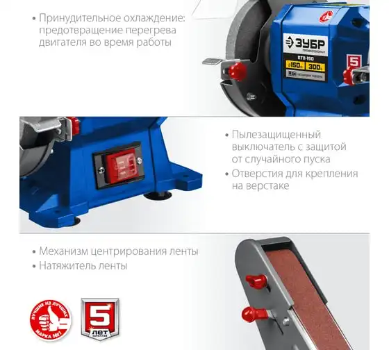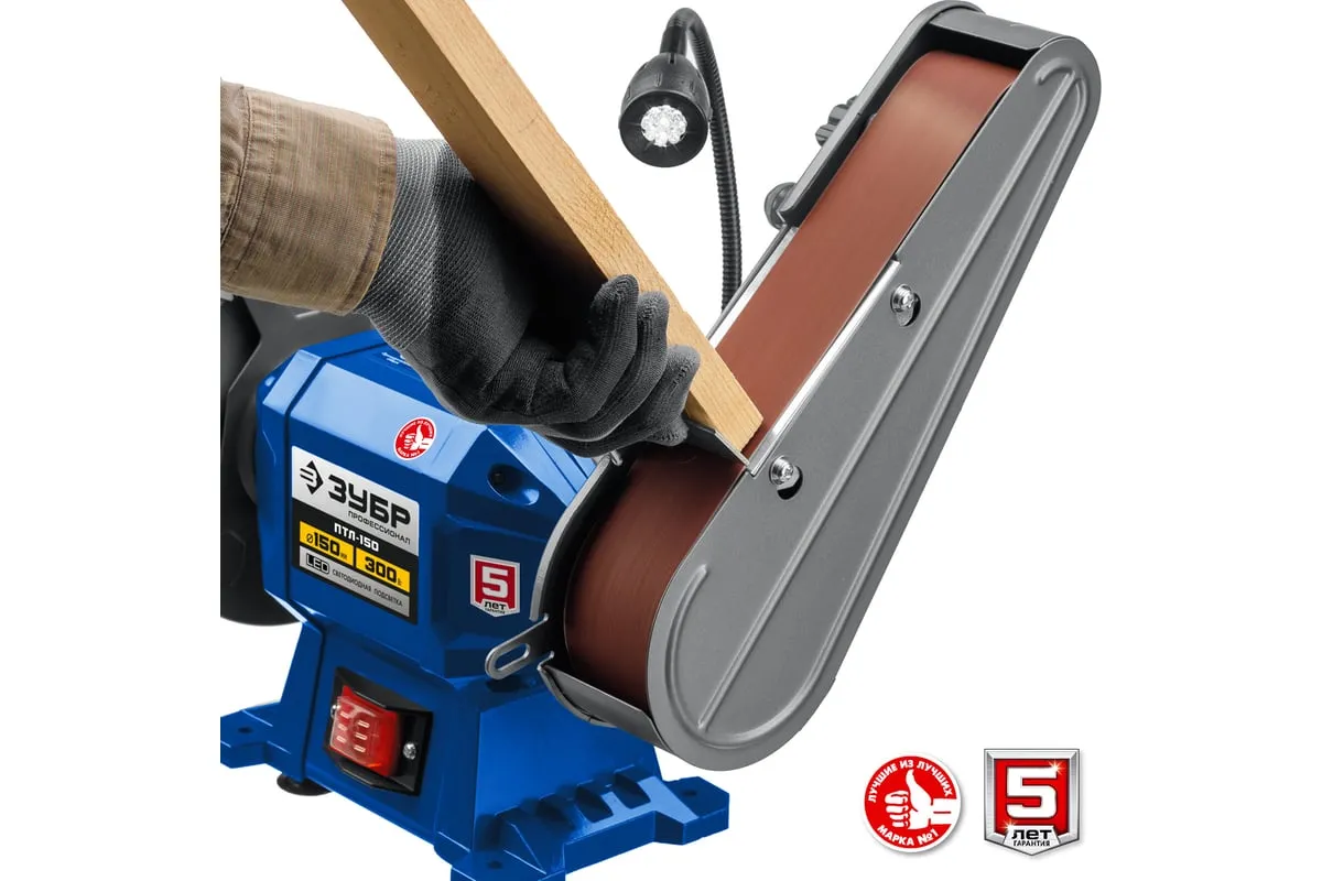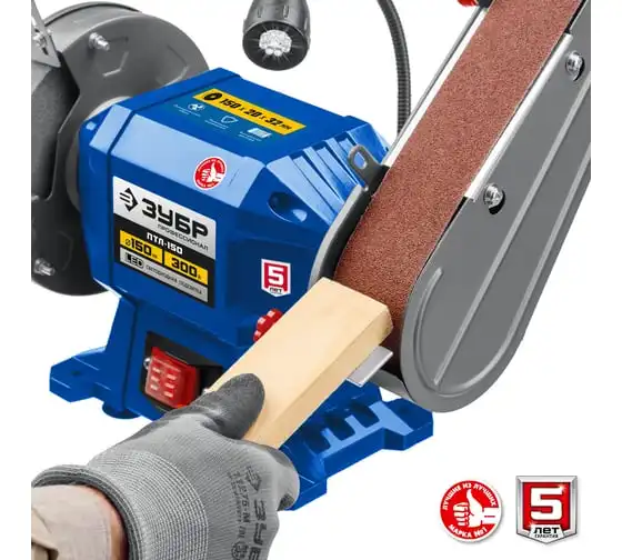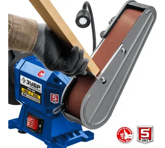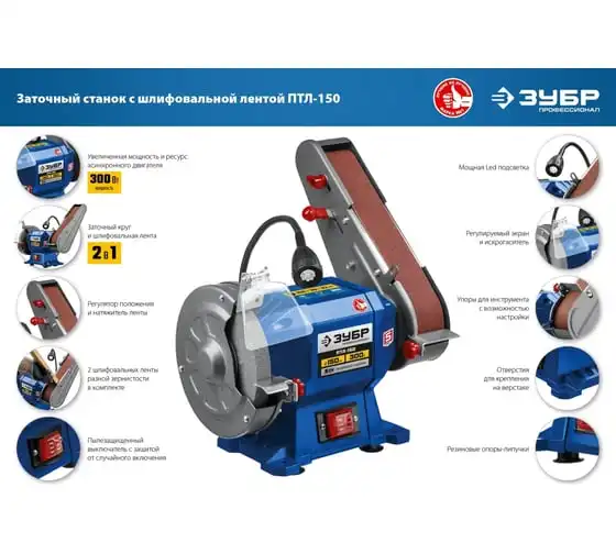 Заточной станок с шлифовальной лентой ЗУБР d 150 мм ПТЛ-150 используется для заточки и шлифовки инструмента и металлических заготовок. Устройство подходит для эксплуатации в мастерской и на небольшом производстве. Данная модель имеет большой ресурс двигателя. Отличается надежным исполнением.